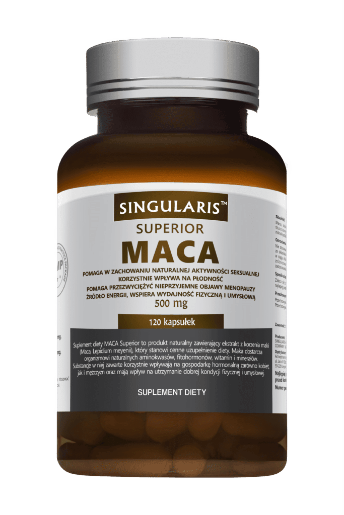 Maca (korzeń maki – Lepidium meyenii) – 500 mg.